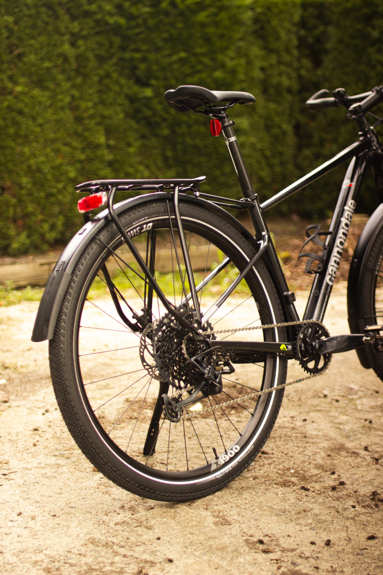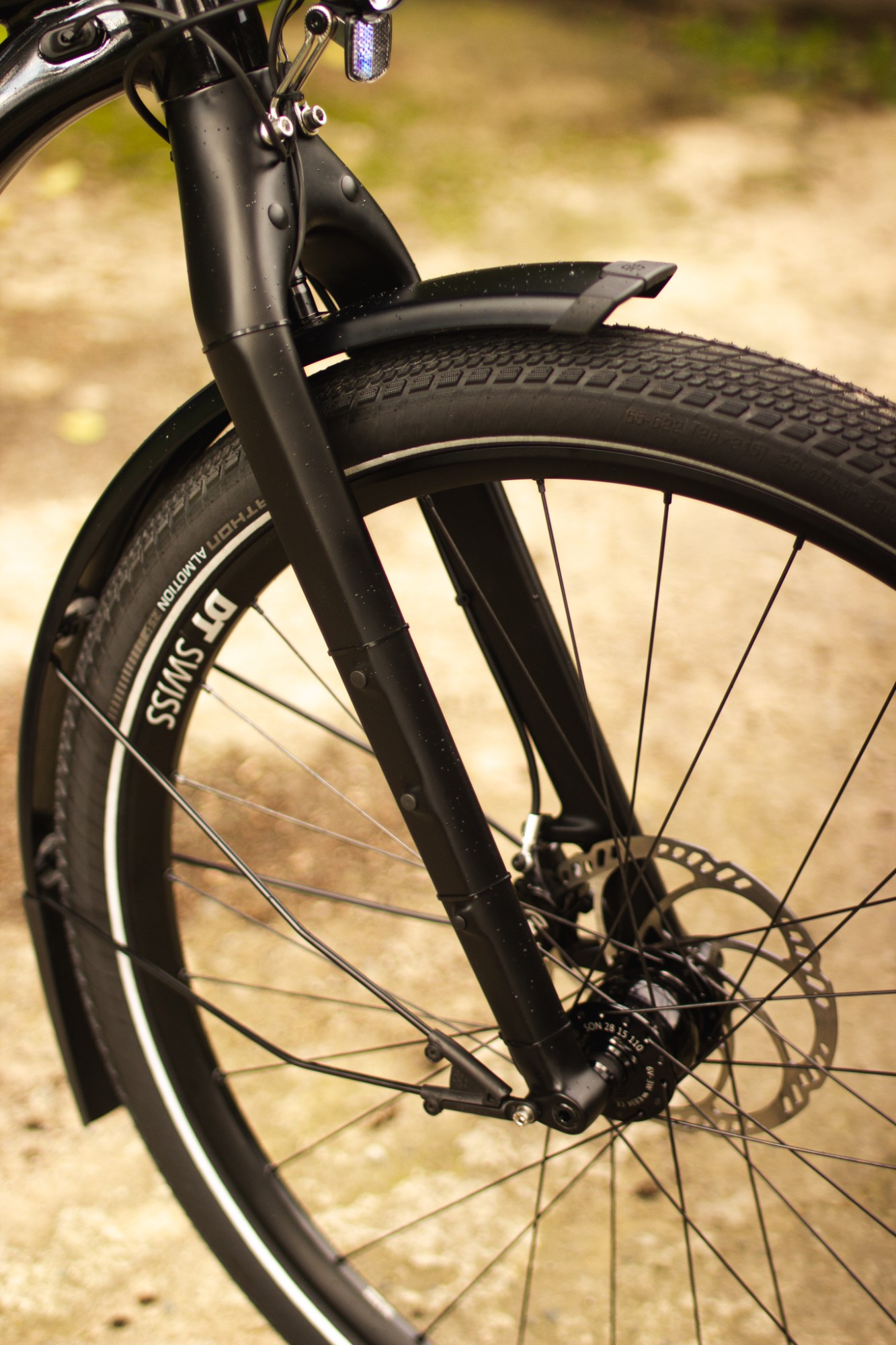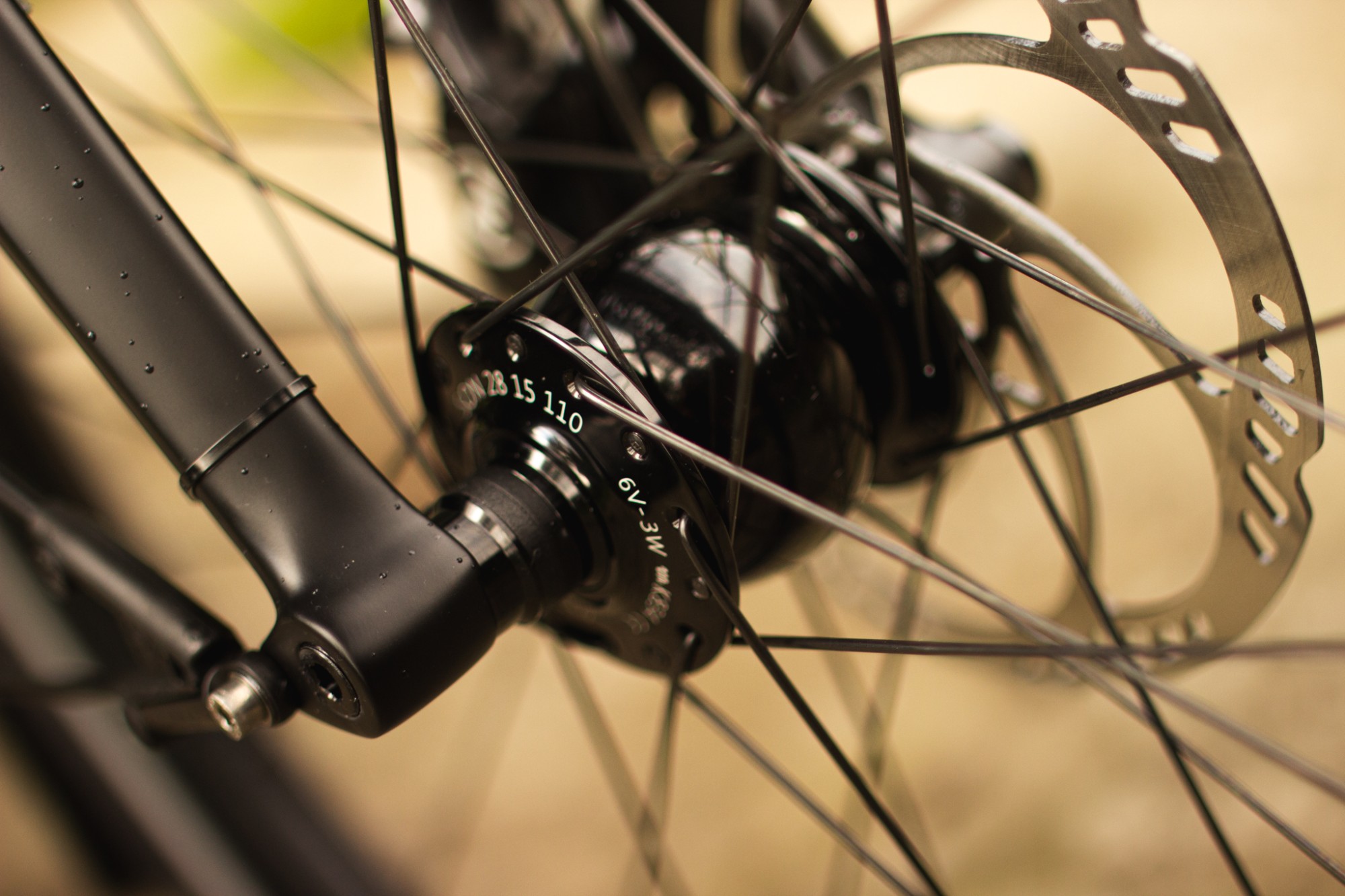 Als Grundlage diente ein MTB von Cannondale mit leichtem Alurahmen und Anschraubösen für Träger und Bleche. Das Rad soll schließlich nach StVZO komplett ausgestattet sein. Starre Carbongabel war ein Muss, damit es leicht wird und so wenig wie möglich Verschleißteile besitzt. Diese hier ist von der Firma Trek.